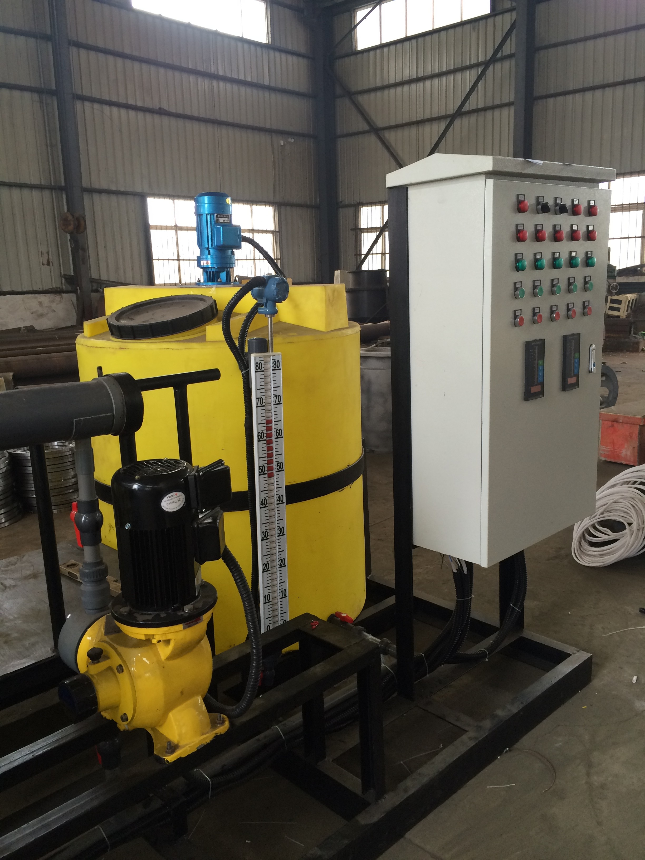 全自動(dòng)一體化加藥裝置以計(jì)量泵為主要投加設(shè)備、將溶藥箱、攪拌器、液位計(jì)、安全閥、止回閥、壓力表、過(guò)濾器、緩沖器、管路、閥門(mén)、底座、扶梯、自動(dòng)監(jiān)視系統(tǒng)、電力控制系統(tǒng)等按工藝流程需要組裝在一個(gè)公共平臺(tái)上,形成一個(gè)組合式單元。配有攪拌系統(tǒng)、加藥系統(tǒng)和自動(dòng)控制系統(tǒng),幾個(gè)固定式可組合成一個(gè)整體。